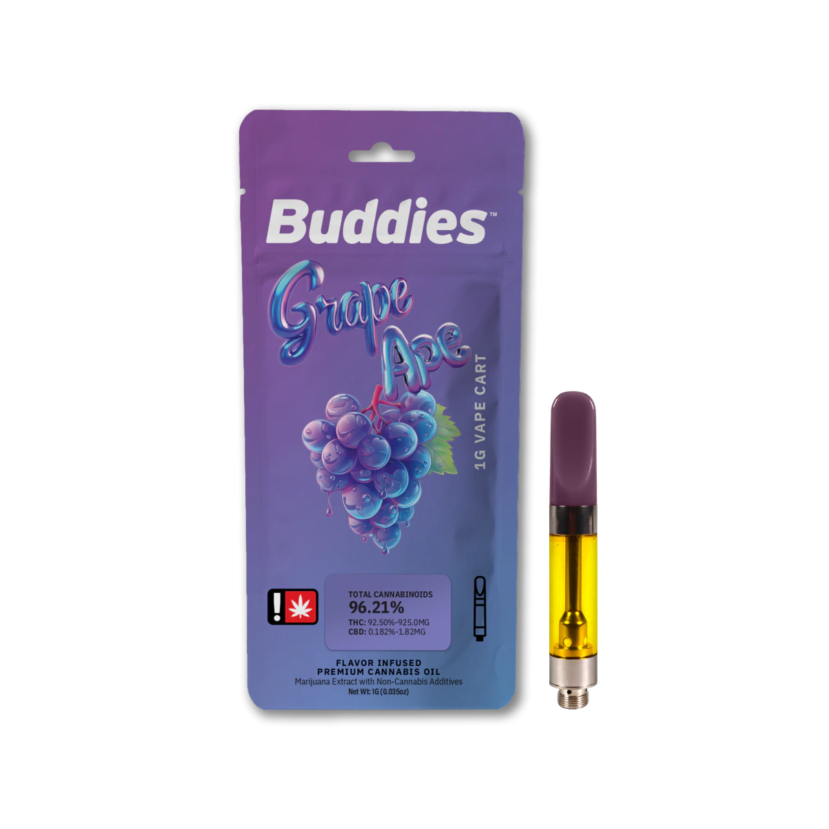 Buddies THC-dominant distillate flavored with organic terpenes. With high quality, individual isolated terpenes, these vapes are mixed with flavors extracted from natural plant sources using plant analytics to recreate tasty profiles and a flower-like effect.