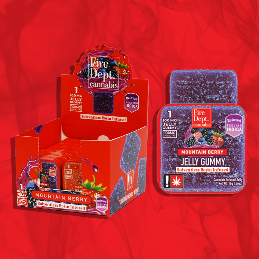 "The Fire Dept. Cannabis Mountain Berry indica vegan gummy is deliciously potent to assist in any relaxation and recovery needs. Infused with indica full spectrum rosin for full body comfort that lasts. 100mg of THC packed into a single gummy for those who need a powerfully potent high or want less gummy with more oil. Enjoy flavorful combinations of sweet mountain blueberries, blackberries, huckleberries, strawberries, and salmonberries, with a hint of weed in every bite! In true Fire Dept. Cannabis fashion, every gummy comes with a unique motivational quote!