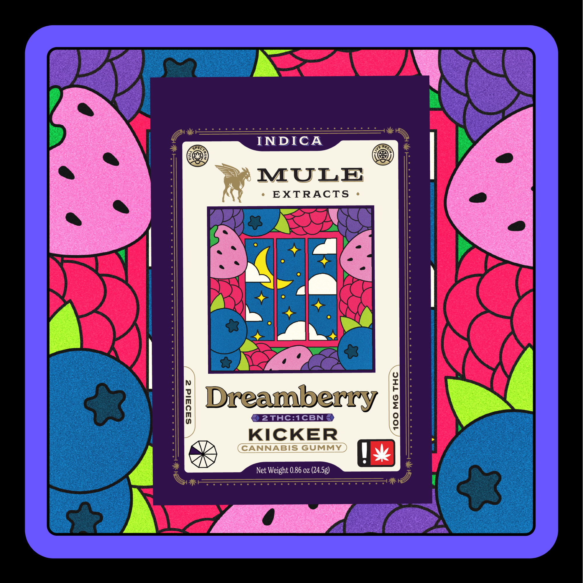Meet the newest flavor in the Mule lineup. Powered by our 2:1 THC:CBN formula, our Dreamberry Kicker is a juicy, berry-forward Indica gummy designed for deep calm and easy evenings