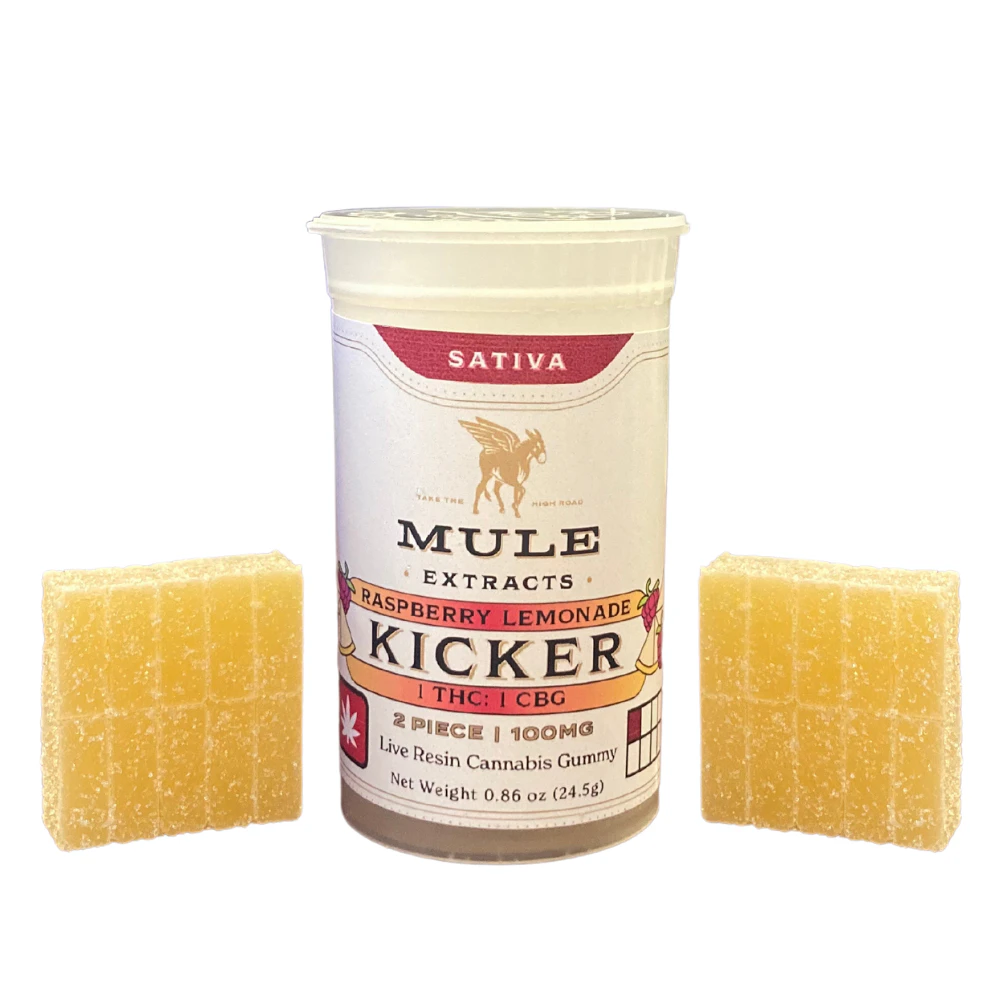 The original Mule Kicker is a 100mg THC cannabis gummy, made with full-spectrum live resin extracts. It's got a reputation for a good bit of kick already, so for the Raspberry Lemonade we pair a sativa strain with 100mg of CBG giving us a 1:1 ratio of THC-CBG. The energetic and uplifting effects of sativas coupled with the pain relief and anti-anxiety benefits of CBG offer a unique high.